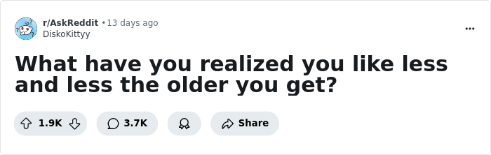 It’s a universal phase that almost everyone goes through, so folks gushed with answers when Reddit user DiskoKittyy asked, “What have you realized you like less and less the older you get?”. Adults out there, we assure you, most of them are highly relatable, so just scroll down and check them out!