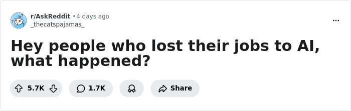 Nobody in this thread lost their job to AI. They lost their job to humans making terrible decisions. It's important to remember that none of this is inevitable.