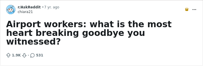 Airport employees have been sharing heartbreaking stories on Reddit of the most upsetting goodbyes they’ve ever witnessed on the job. From people breaking down because they have to leave their loved ones to parents mourning the sudden loss of a child, we'll warn you right now that these stories may be hard to get through with dry eyes. So get your tissues ready, and upvote the responses that read like a tear-jerking movie scene.