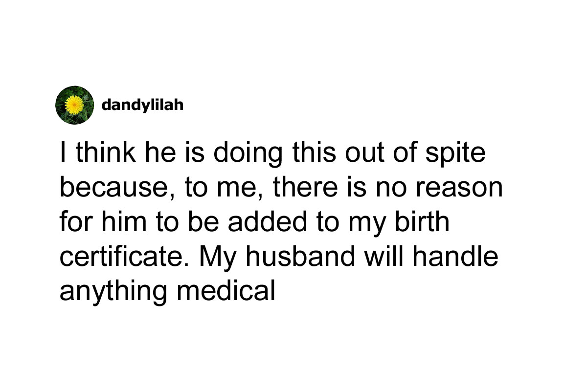 Load More Replies...Unless he is on the hook for child support for all the years he never paid it there is no conceivable reason he deserves to now be on the birth certificate. He is trying to be next of kin for his own selfish reasons at this late stage.