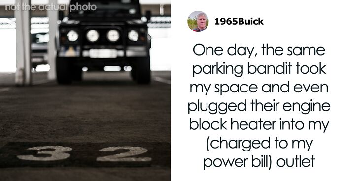 I assumed this was a visitor of my neighbor directly above me, as I would sometimes come home for lunch and see that most other cars were gone for work, leaving their spaces open for visitors, whereas her space had a car with flat tires. Initially, I tolerated the behavior, as I could sometimes take a visitor’s spot or park on the street. However, as the season grew colder, it became annoying. One day, the same parking bandit took my space and even plugged their engine block heater into my (charged to my power bill) outlet.