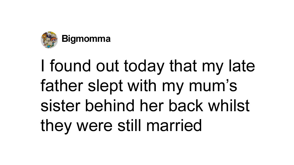I (F37) found out today from a reliable source that my late father slept with my mum’s sister behind her back whilst they were still married.