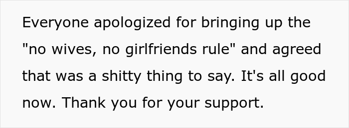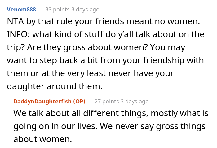We must admit that the commenters reacted very sensibly to this story, standing up for the girl and her dad. In fact, as one of the people in the comments pointed out, this “no wives, no girlfriends” rule seems quite discriminatory – with this the OP agreed, acknowledging that he would definitely forward the entire comment to his friends.