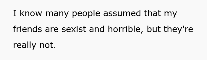 "A lot of people are assuming my friends are sexist, but they're not." Narrator: his friends are definitely sexist.