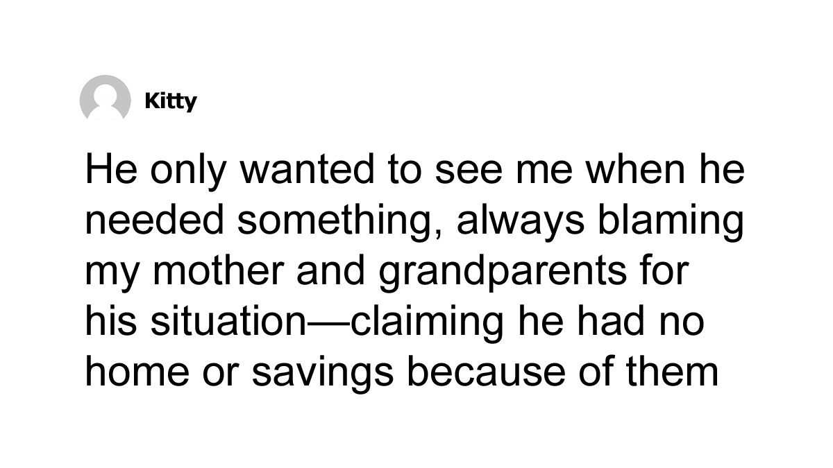 At times, I didn’t even know where he was or what he was doing. He only wanted to see me when he needed something, always blaming my mother and grandparents for his situation—claiming he had no home or savings because of them, which wasn’t true.
