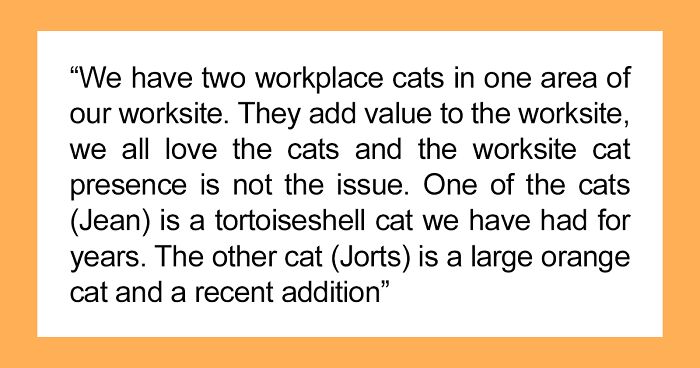 Anyway, the story goes that OP’s workplace has two resident cats: Jorts the ginger tabby and Jean the tortoiseshell. Jean’s been around for a while, and is considered the “smart one,” while Jorts… well, he is explained as “a simple guy.”