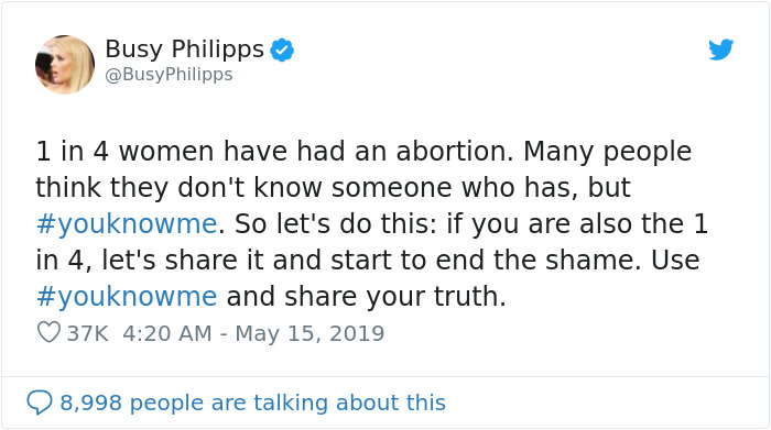 The phrase 'you know me' struck a chord with her producer Tina Fey, who encouraged her to start the hashtag. Philipps told The New York Times,"She said, 'I think you hit on something, which is you know me,'" but admitted to the outlet she felt too "overwhelmed" to do it right after opening up about her story. After the Alabama Senate passed another restrictive abortion bill, effectively completely banning it, which has since been signed into law, she tweeted out against it and used #YouKnowMe. She encouraged women to use the hashtag to share their own abortion stories to "end the shame" that surrounds the procedure. Like the similar hashtag #ShoutYourAbortion, it quickly went viral.