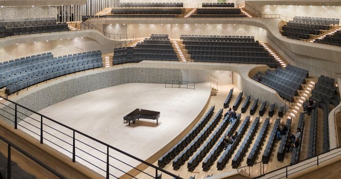 The hall, called the Elbphilharmonie, can seat 2,100 people and cost a whopping $843 million USD. It was designed by Swiss architects Jacques Herzog and Pierre de Meuron, who are perhaps most well known for designing the Tate Modern in London and the Olympic “Bird’s Nest” Stadium In Beijing. They joined forces with Japanese acoustician Yasuhisa Toyota, famous for the Walt Disney Concert Hall in L.A and the Suntory Hall in Tokyo, and together they used algorithms to create the auditorium’s 10,000 unique acoustic panels.