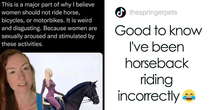 “Imagine naming yourself ‘Alpha Masculinity’ but being scared that a horse was gonna steal your girl” – an online user took it to TikTok to roast a Twitter page, or in particular, a thread that a man wrote concerning his disapproval of women riding horses, bicycles and motorcycles because of the sexual stimulation that these activities, apparently, bring them. The video has managed to receive nearly 163K likes, 771.9K views and 162.7K worth of comments discussing this odd statement.