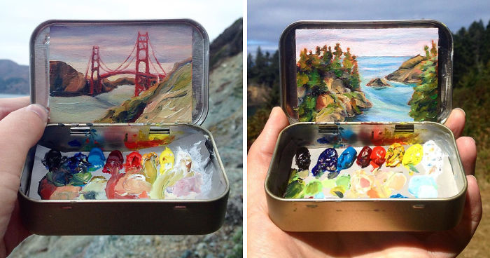 Colorado-based artist Heidi Annalise has an amazing talent to move wide open spaces into cute tiny boxes without losing their grace. She paints mesmerizing landscapes in mint tins where she attaches small pieces of palette paper to the top, and lays out a small palette of colours to work with on the bottom.