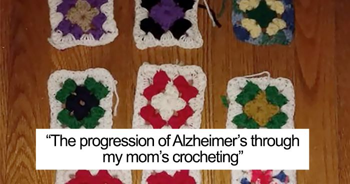 Using 14 crocheted squares made during the 2 years following her diagnosis, the woman shows the slow progression of her mother’s condition – and her fading abilities to complete the skill she once loved. “…She made squares for a while, then the circles, then the little pieces of crochet, until she got to the point where she just carried around the needles and yarn in her purse,” the user writes on Reddit. “It has been a few years since she was able to speak and several since she was able to identify who I am.”