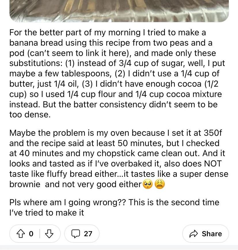 The r/ididnthaveeggs subreddit is a fairly large one, boasting 321k members from all around the world at the time of writing. The idea behind the group is very simple. It’s meant to gently poke fun at home chefs who leave terrible recipe reviews. First, they don’t follow the recipes. Next, they complain that the recipes are somehow to blame for their failed results.