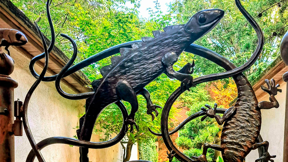 The lizard gate at the Atlanta Botanical Garden looks cool and fits its location perfectly. Created by blacksmith Andrew Crawford, it was installed at the Gardens' entrance to the Japanese Garden in 2012. That year, an Atlanta Blooms event took place, and the gate was the addition to the Gardens for that occasion. Crawford has also designed another gate for the Atlanta Botanical Gardens, the "Herb Garden Gate."