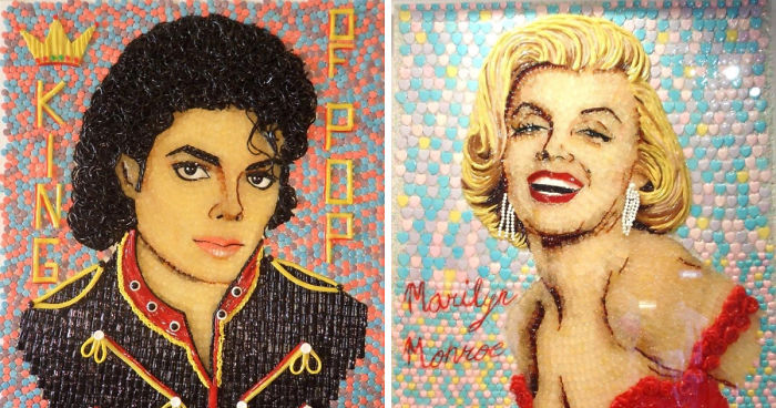 The Artist uses gummy bears, liquorice, M&M’s, bubble gum and after-dinner mints to craft colorful portraits of various celebrities. Each of his tasty artworks contains over 5,000 individual sweets. Ramos says he got the idea to use sweets as a medium for his art four years ago, while he was in a park. He saw a dad give his son a piece of candy to sooth his pain, and after seeing the boy smile, he realized that sweets make human beings happy. He kept thinking “what if they saw one of their favorite artists enshrined in their favorite sweets?”. That thought turned into a reality soon enough, and now Cristiam Ramos’ celebrity portraits sell for up to $3,000 to $18,000, depending on the size of the picture and amount of sweets used. Celebrities immortalized in candy by Ramos also include Justin Bieber, Michael Jackson and Elvis Presley. Believe it or not, there’s no paint used in any of them.