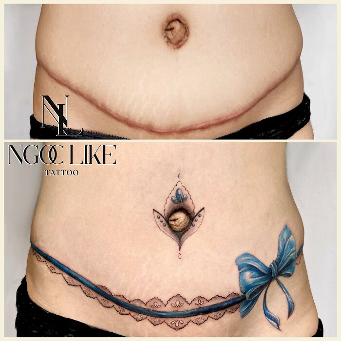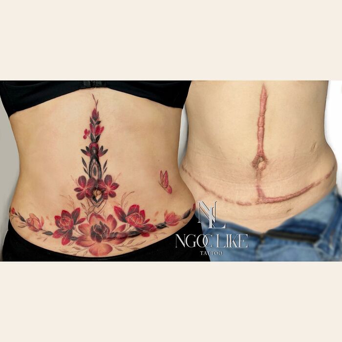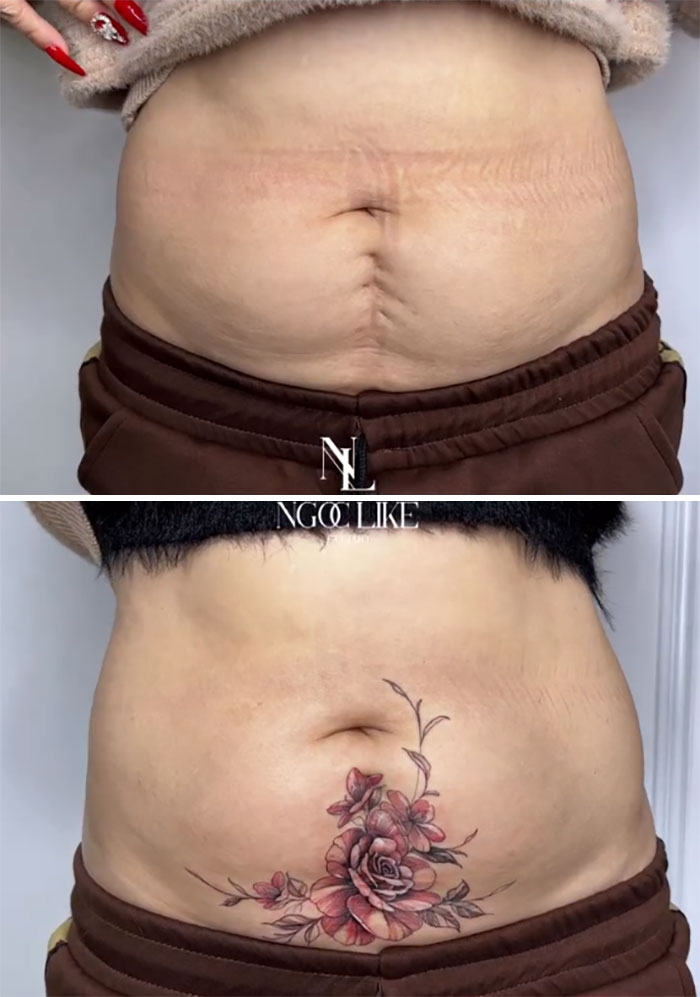 I'm still amazed seeing these photos. On the left her actual scar is straight. I had my hysterectomy when I was 20. Mine is very crooked., but a tattoo like this would look nice, but I'm 72 now and no one would get to see it.