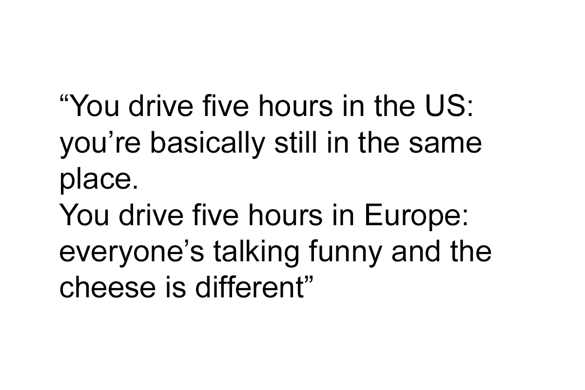 30 Things You Should Know Before Visiting The United States For The First Time Ever, According To Americans You drive five hours in the US: you’re basically still in the same place. You drive five hours in Europe: everyone’s talking funny and the cheese is different.