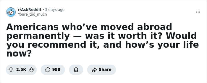 But if we want to delve into specifics, here are some responses to a recent online thread. These North American Redditors shared why they moved out of their home country and whether it was worth it.
