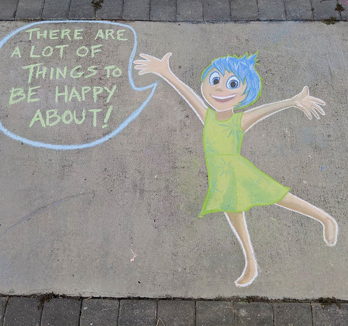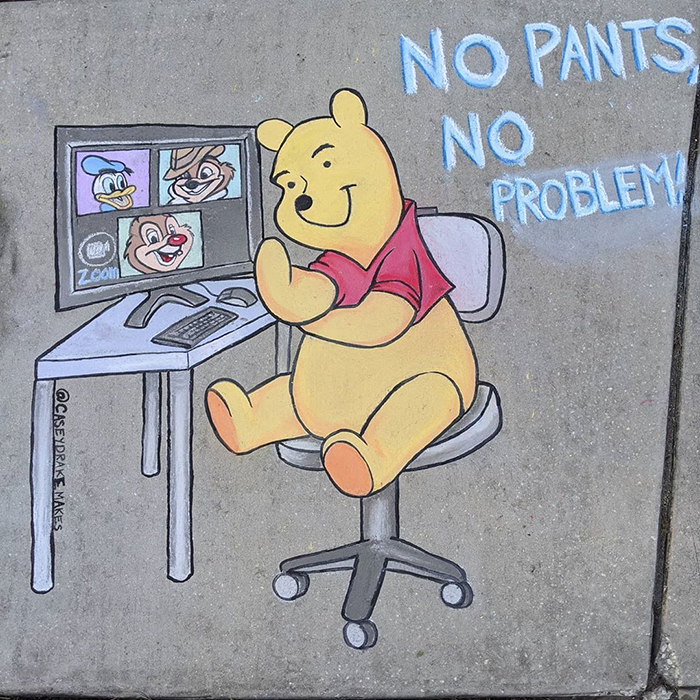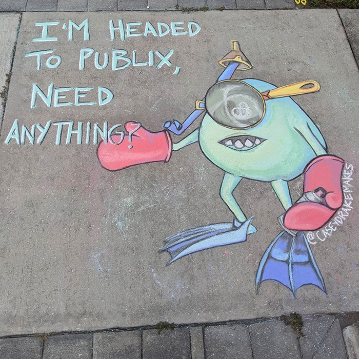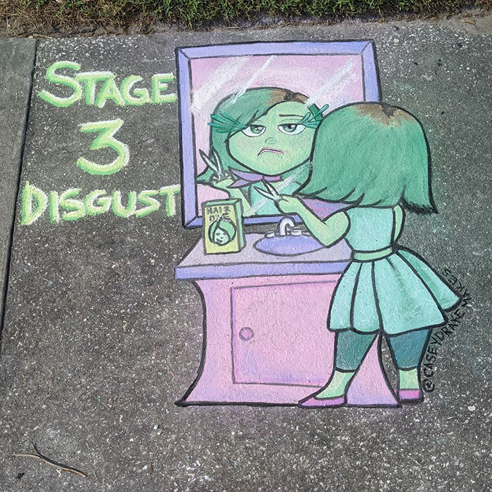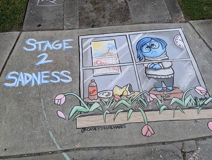 This Florida-based artist is using the sidewalk near her house to spread some positivity and cheer people up during these anxious times. Casey Drake—a self-taught artist, former biology teacher, and a mother of two—is brightening up the streets of her neighborhood with colorful and amusing chalk drawings. Some of the artwork is quarantine-themed, like the series of "5 stages of quarantine" drawings, seemingly inspired by the Pixar movie Inside Out. "All of the drawings are on the sidewalk in front of my home," Casey told Bored Panda. "I usually start by trying to think of something that is new in our lives, such as hoarding toilet paper or wearing masks and gloves. Then I think through the different characters I know and see if one fits. Sometimes it doesn't all come together until I'm already drawing, though." Scroll down below to see the fun chalk drawings from Casey and vote for the ones you liked the most! Also, Casey told us she plans on making tutorials on her YouTube channel so stay tuned!