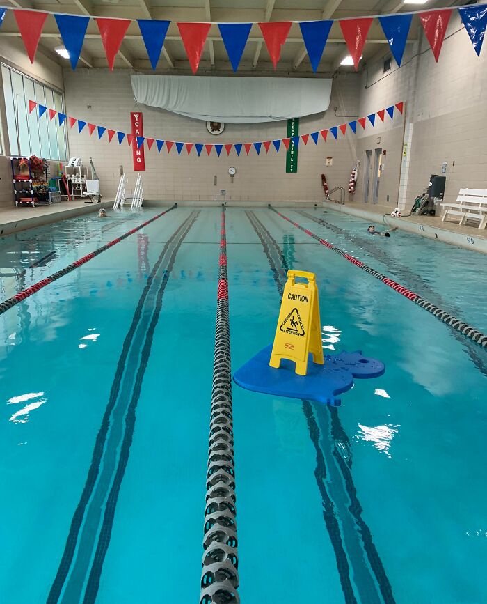 Put A “Caution Wet Floor” Sign Atop Of A Giant Floaty Mat. Swimmers & Colleagues Got A Kick Out Of It