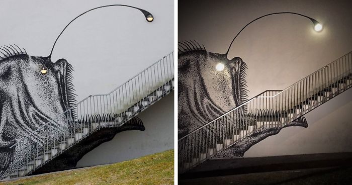 Norway-based street artist Skurk has done quite a few impressive murals, but this time an art collective called BART gave him quite a challenging task – a building wall with a staircase and light bulbs.