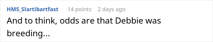 Load More Replies...The "she was likely breeding," comment was worse. Of all the ways to say you worry if she has children.. like wtf. Edit: typo.