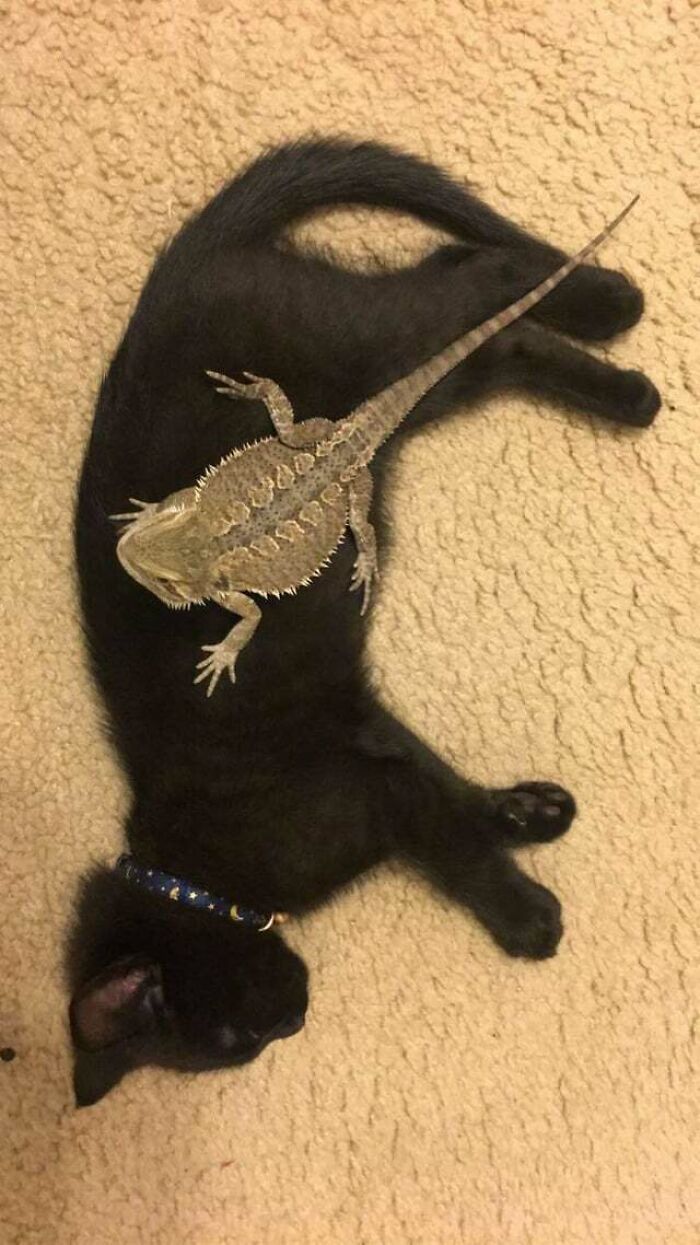 My Bearded Dragon And My Roommate's Kitten Are Buddies