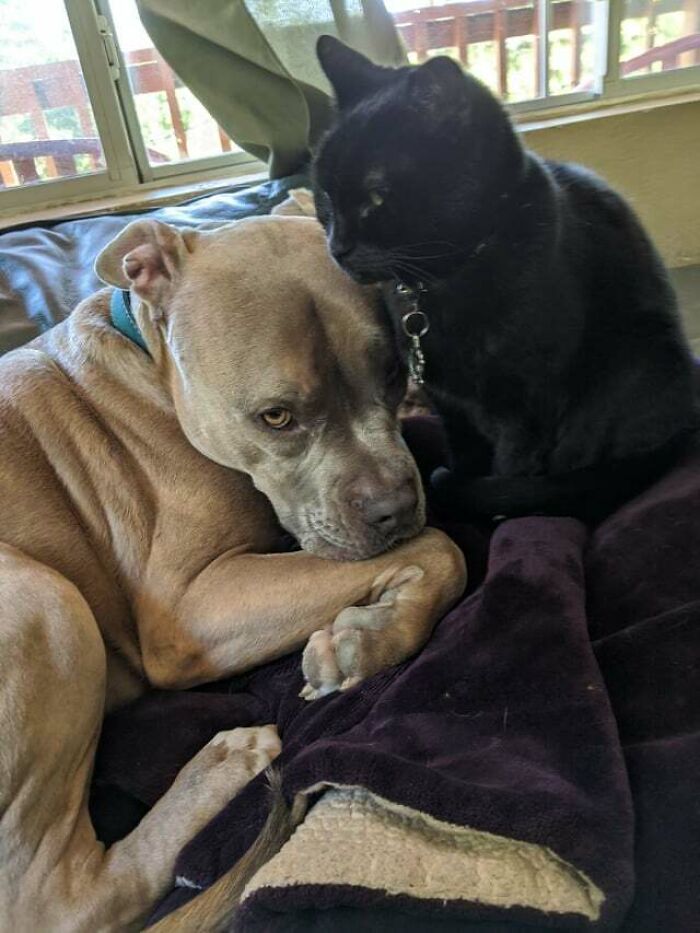 My Pitbull Mix Pup Ronin And My New Kitten Nox. We Were Worried They Wouldn’t Like Each Other