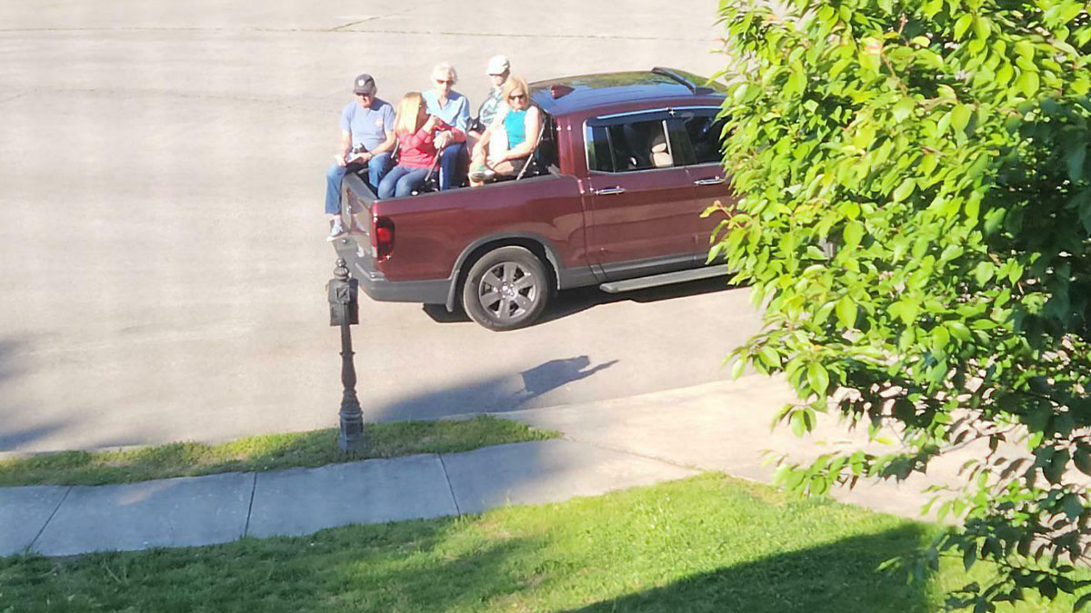 Aren't they breaking the law, sitting in the back of the truck on movable chairs with no seat belts?