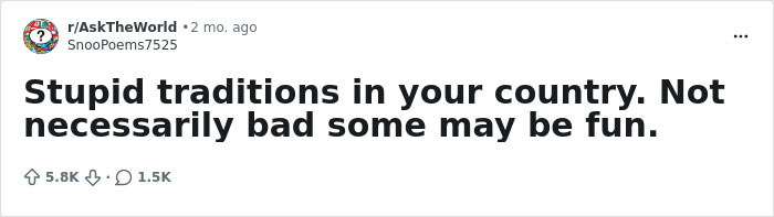 But some traditions can be so outrageous and silly that even the locals think they're a little bit too much. When the user u/SnooPoems7525 asked people online to share the "stupid traditions" in their countries, folks from all over the globe had something to say. Some picked pretty bad ones; others focused on those that are just harmlessly fun yet still pretty ridiculous.