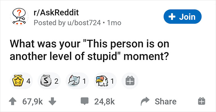 So when Reddit user u/bost724 posted the question “What was your 'This person is on another level of stupid' moment?” on r/AskReddit, it instantly got 67.9k upvotes. It turns out, people on Reddit have been through a whole bunch of intolerable stupidities.