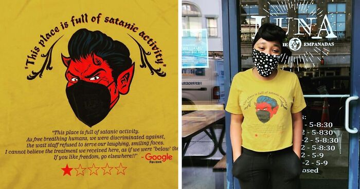 Even though the situation is serious and anti-maskers in all countries are considered to be wounds of society, the owner of Luna Rotisserie tried to make out the best of this experience and slapped the hilarious review accusing them of glorifying the devil on a T-shirt.