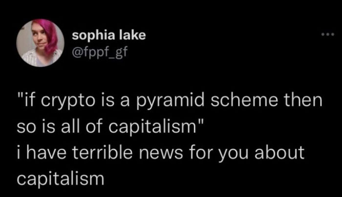 Every speculative investment is a pyramid scheme. Capitalism is not, because it is based on producing actual stuff with an actual worth. Crypto is just a thing you buy to someone smarter than you because you hope you will be able to sell it for an even higher price to someone dumber than you.