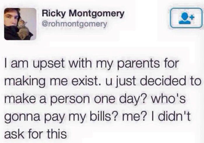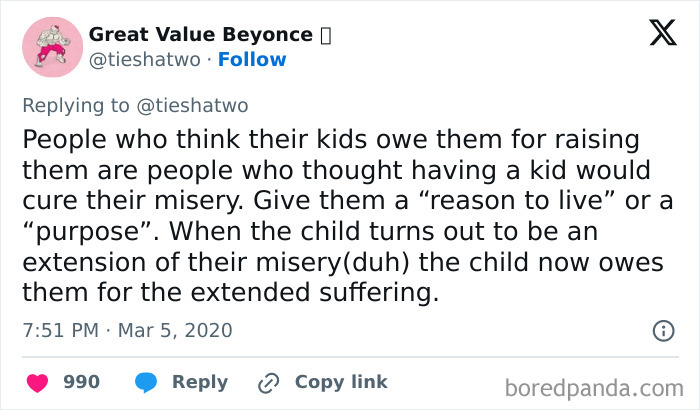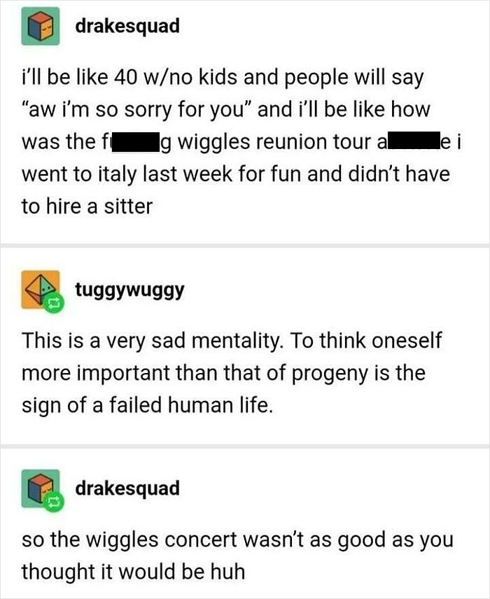 Load More Replies...I still laugh when anyone asks "Don't you miss not having kids?" What? How can you miss a 3rd arm or leg when you never had it? And anyone I have met who has kids, and knows I am single with no kids, ALWAYS ask if I will sit with their kid. I'd actually sit with a dog or cat, but NEVER a kid. And they NEVER ask a man these questions!!!!