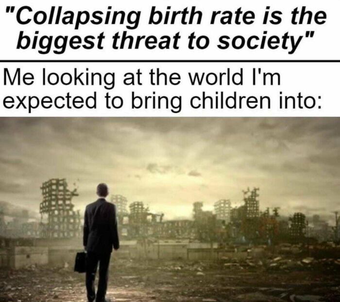 Yeah, if I had to make the decision again now I wouldn't have kids. Mine are teens and I'm totally crippled with anxiety over their future lives and quite rightly as society probably only got another 50-100 years before total apocalypse so yeah not a good time period to create more people to suffer.