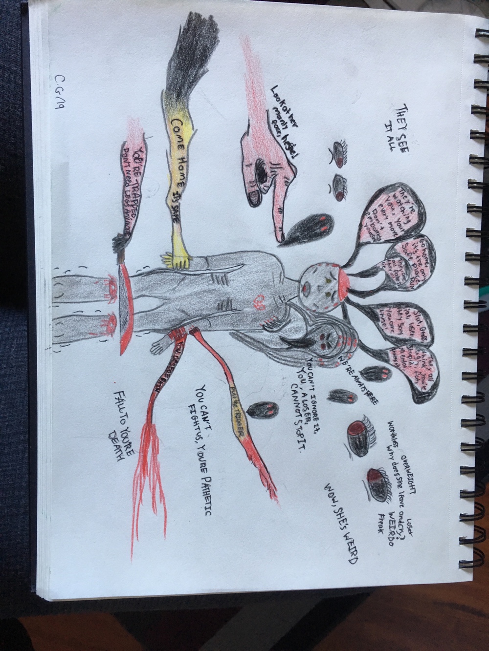 I sketch and sometimes paint about my social anxiety and depression. It helps me to get it on paper. My depression and anxiety were developed through the years of me getting bullied- for lookin like a man...I see a psychologist and I’m learning to cope with my panic attacks. I’m 17 and live in Canada