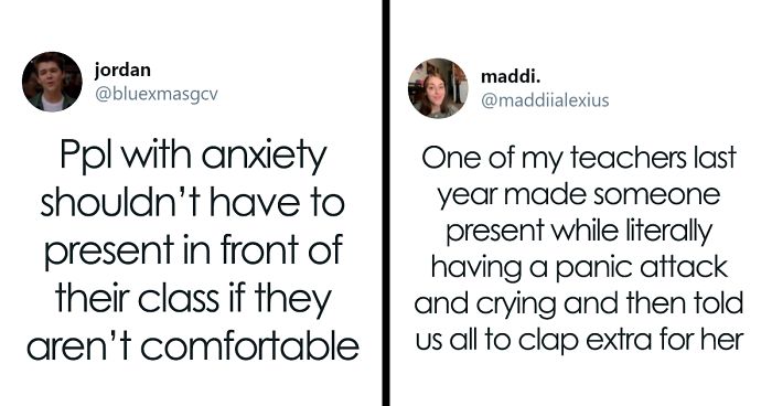 So, this Twitter user suggested that schools shouldn’t force anxious people to present in front of class