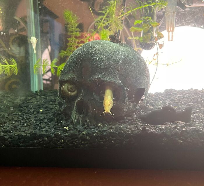 My Loach And Snail Worked Together To Make Their Aquarium Skull Look Menacing Af