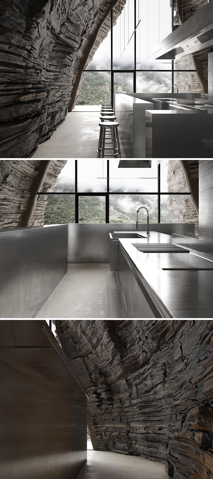 A restaurant inside a cave, that must have stunning views! The contrast between a natural element like the rock, and a mirrored surface like the stainless steel, creates an unique and intriguing atmosphere!