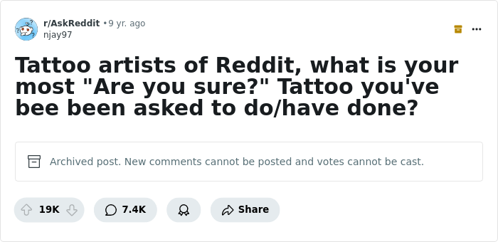Too many of those are about artists refusing to do tattoos because *they* think it's a dumb idea. It's obviously their right to refuse to do it themselves, but it's not their right to decide whether someone's tattoo idea is dumb.