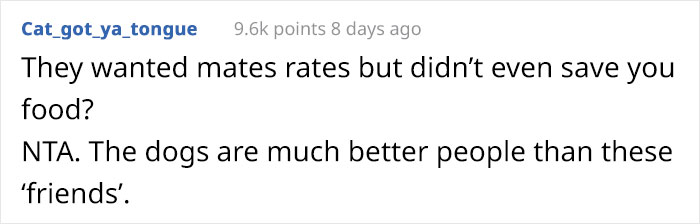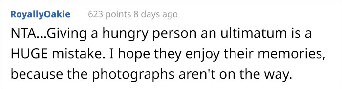 Load More Replies...My hackles went up at "food is being served and I was told I cannot stop to eat because I need to be photographer; in fact, they didn't save me a spot at any table". My photographer was a friend who was paid full-price (they're a professional) and fed same as the guests.