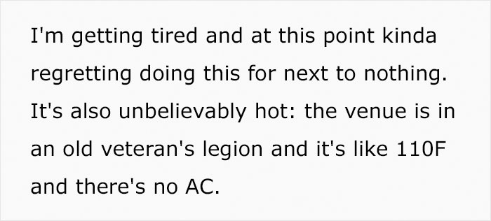 That’s why a friend of theirs reached out, asking to be the photographer at their wedding. They offered her 250 dollars for 10 hours of work. That’s very little money for that much work, but the redditor saw it as helping out a pal on a “shoestring budget.”