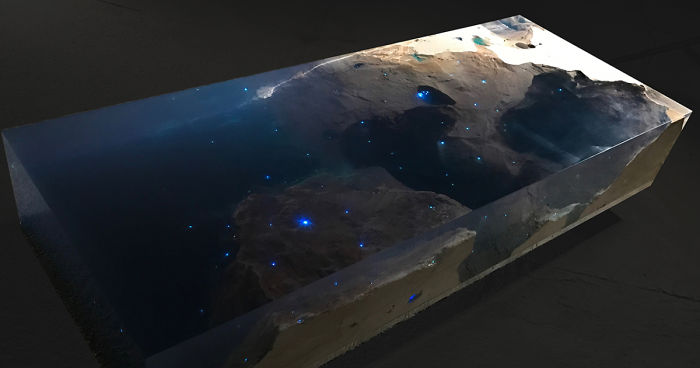 The table “STARRY SEA” gives you both: the stars and the sea in one piece of artwork, beautifully designed and ornamental. This table which has the appearance of a portion of the Caribbean Sea; magically metamorphose at night like a starry sky in your living room.