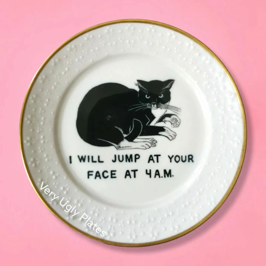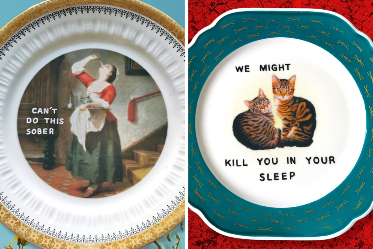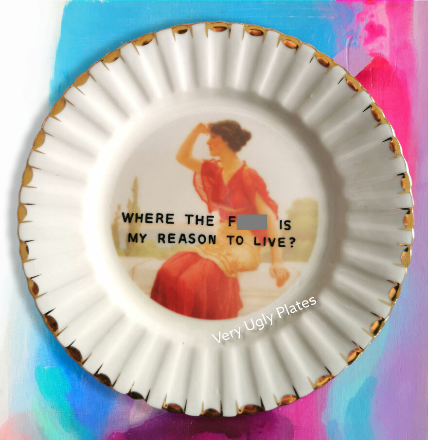In my designs, I created a delicious mix of sass and class, and serve them on a plate. Literally. To put it plainly (as if on a plate), I buy old porcelain plates and give them new life by painting funny captions on them. Check out my designs and tell me what you think!