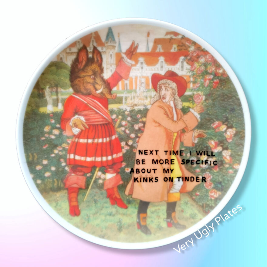 Sometimes when I see a plate, I already know what story I want to tell with it. That's the easiest case. Most of the time, I just buy plates with pictures that I see potential in and they are waiting for the perfect text. Currently, in my collection, I have around 400 plates waiting for their time to shine. Sometimes I think about myself as a machine that hoovers situations, thoughts and interactions, processes them and then some funny plate comes out.
