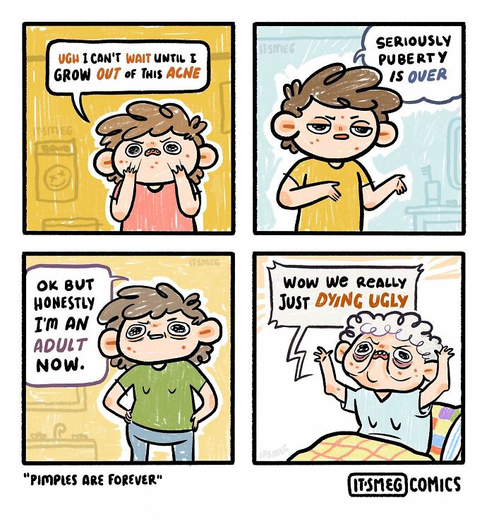 Meg studied Fine Art at a community college for two years, during which time, according to the artist, she was a bit of a "shy art nerd". "I began illustrating my experiences and posting comics to Facebook since I struggled with openly expressing myself offline; I usually got good reactions, and my friend Toby suggested I put my work on Reddit. I had a few panels on there that did particularly well, and noticed peopled seemed to like my 'funnier' content (big surprise). After graduating, I took a few years off from making comics to pursue a career in art; that obviously didn't work out, so I'm back to making comics - but this time for fun, I'm way more extroverted than I was when I started."