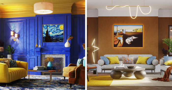 While artists love to take inspiration from the world to create breathtaking works of art, digital artist and interior designer Amaliya Brenneman decided to flip the script, using four of the most famous paintings ever created as inspiration for her interior designs. She wondered how history’s most celebrated painters, including Vincent Van Gogh, Leonardo da Vinci, Edvard Munch, and Salvador Dali, might decorate the insides of their homes based on the color palettes of their most cherished works.