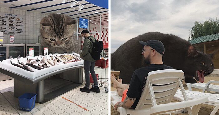 A few years back, artist Andrey Scherbak pleasantly surprised us with his supersized cats added to pictures. To this day, the artist continues exploring this whimsical concept and we are more than happy to share his latest creations.