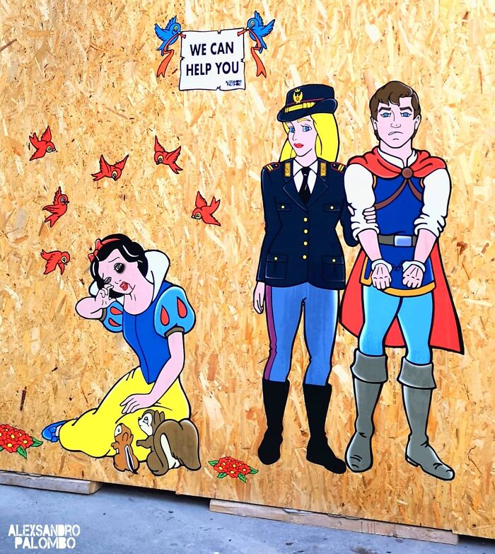 With that in mind, Italian artist Alexsandro Palombo, a fan of pop culture who usually plays with modern icons and makes awareness series, used Simpsons characters and Disney princesses to pose in his street art as victims of violence or cancer to address those painful topics.
