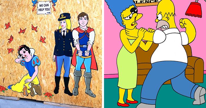 For an awareness campaign, Italian artist Alexsandro Palombo portrayed Disney princesses and other female characters as the victims of violence