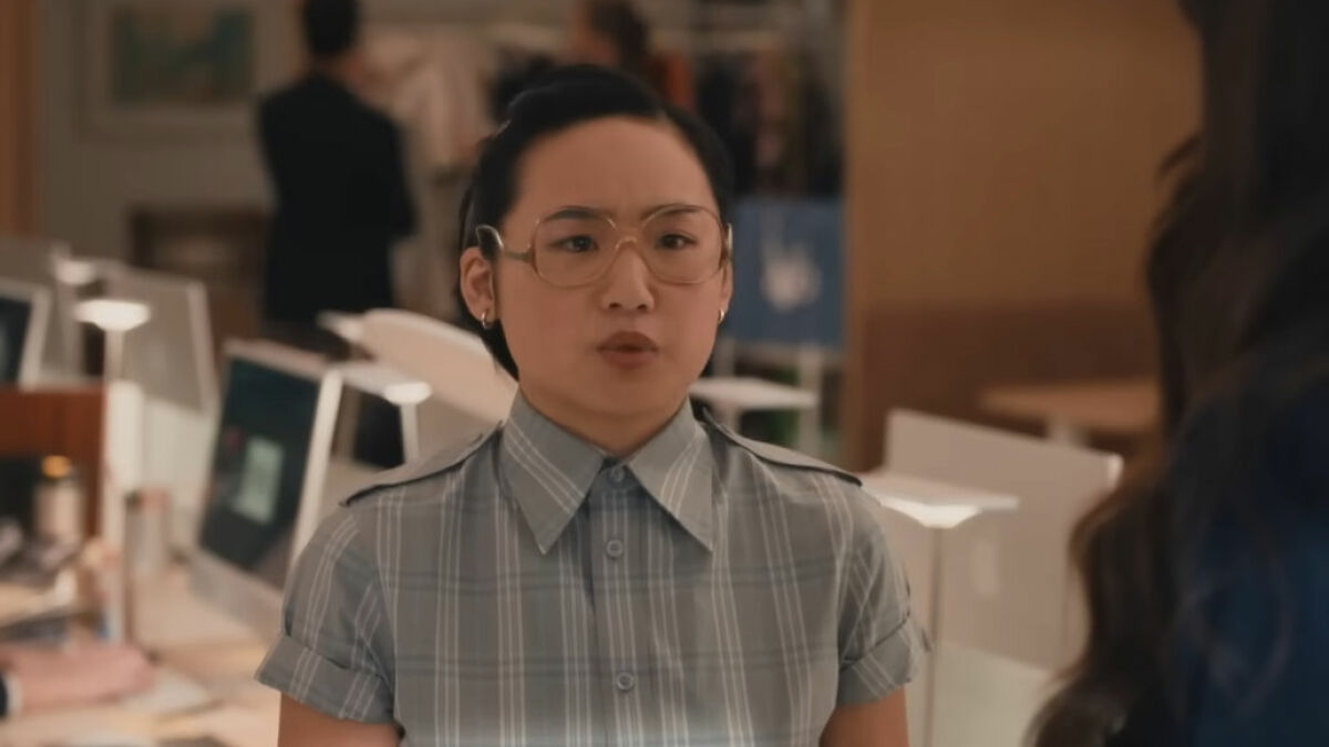 Anne Hathaway’s character, Andy, returns to Runway magazine and meets her new editor, Jin Chao, played by Helen J. Shen